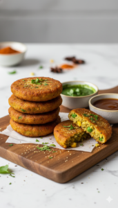 These crispy patties can also be elevated as the base for aloo tikki chaat, topped with chickpea curry, sev (crispy gram flour noodles), and a squeeze of lime-turning a humble snack into an indulgent street-style feast.