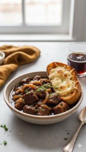 beef Carbonnade⁢ Reinvented: savory beef ​stew in rich‍ broth with ‌caramelized⁢ onions and fresh parsley ⁣garnish