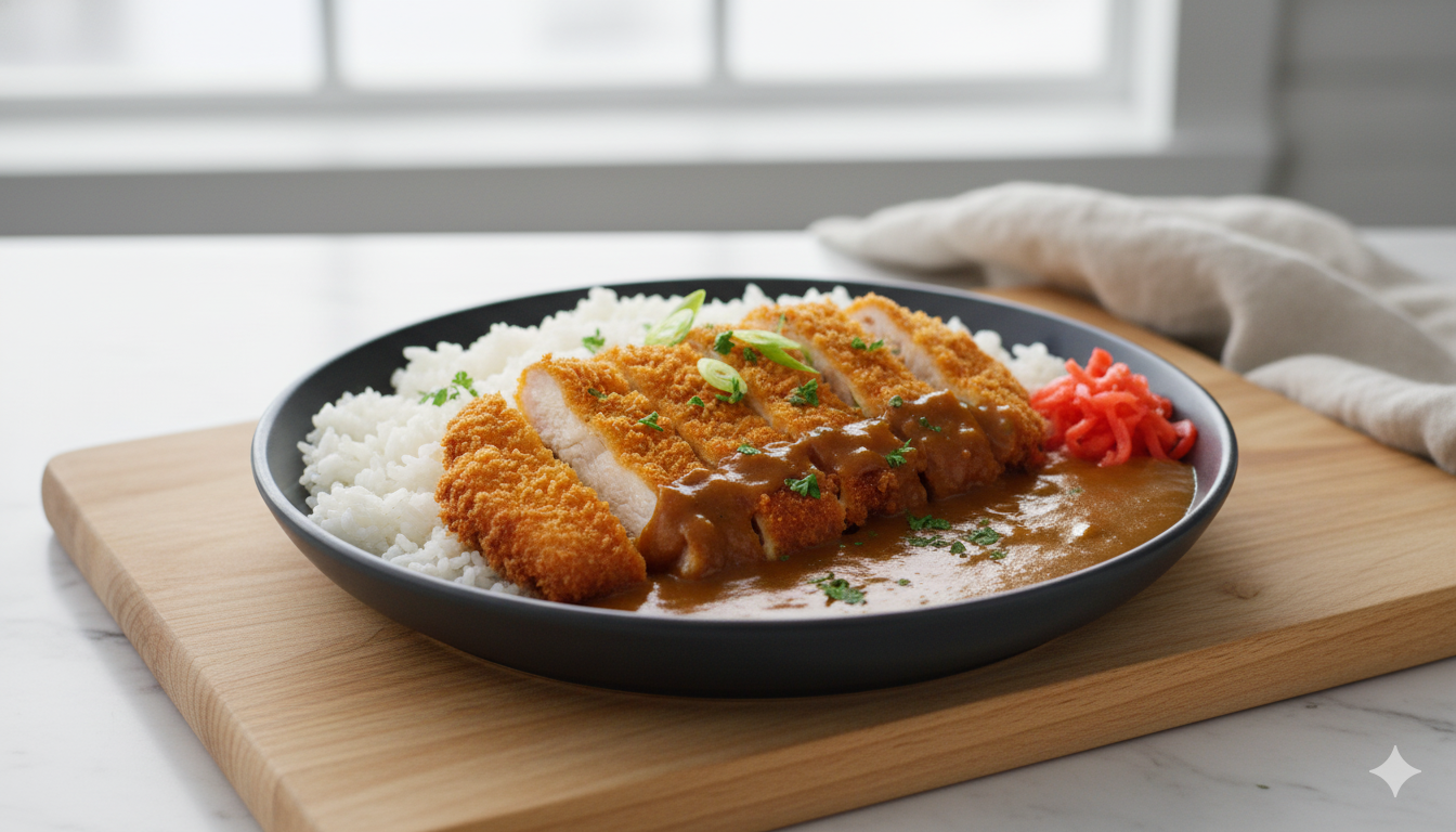 Crispy Delight Chicken Katsu Curry plated with fluffy rice, fresh scallions, and pickled accents.