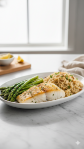 Wholesome baked cod with asparagus & nutty brown rice plated beautifully