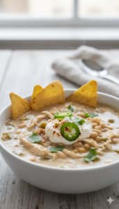 A final sprinkle of fresh cilantro leaves and a generous squeeze of lime juice create a zesty lift that brightens every spoonful, making your creamy white chicken chili a feast for both eyes and palate.
