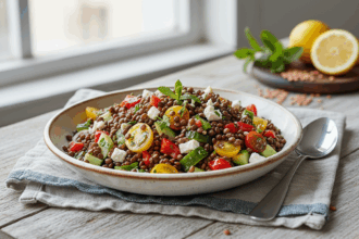 Bright Bites unveils the vibrant charm of Mediterranean lentil salad-a colorful blend…