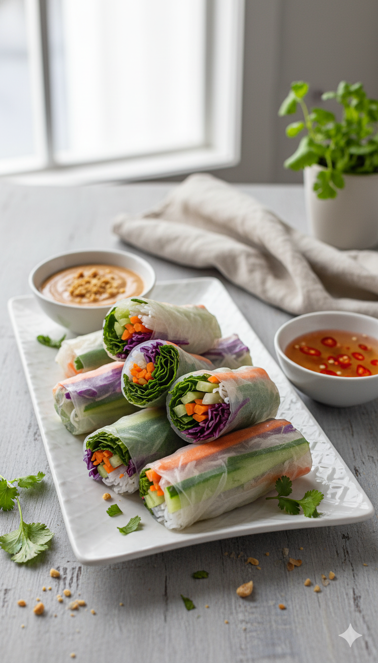 Present your vibrant spring rolls on a large platter garnished with extra fresh herbs and a light sprinkle of toasted sesame seeds. Pair with small dipping bowls of tangy peanut sauce, classic hoisin-chili dip, or a zingy lime-fish sauce blend. For a festive touch, arrange lemon or lime wedges alongside and a scattering of crushed peanuts for crunch.