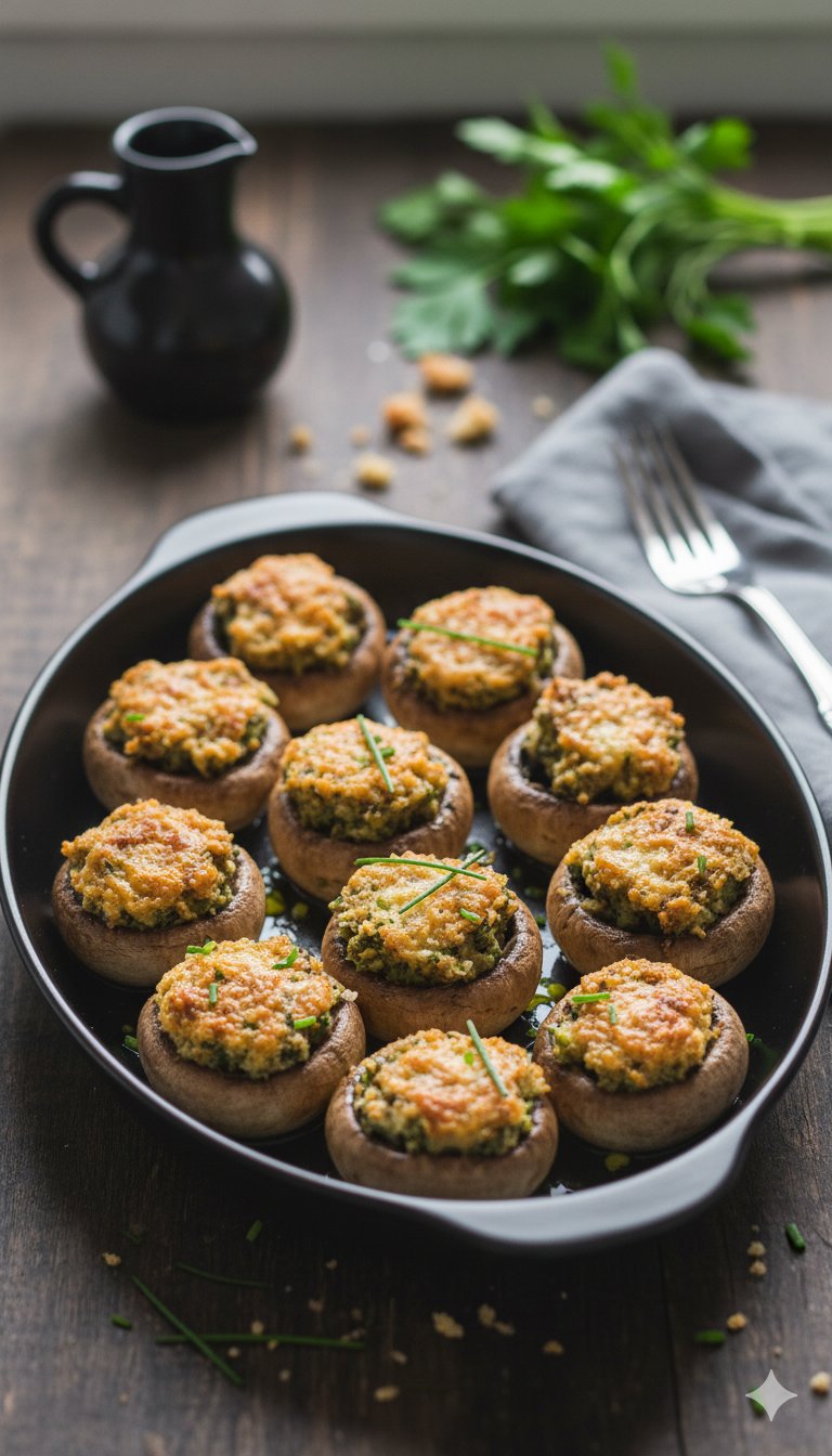 Savory Secrets perfect stuffed mushrooms with golden crispy tops and fresh parsley garnish